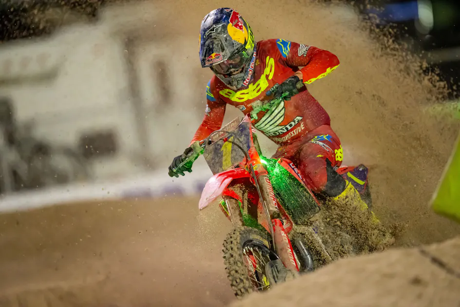 In the end, there were four men at the high-rollers’ table on the outskirts of Las Vegas. It was the last hand of the tournament, the one with the biggest pot of all. A million-dollar bonus was in the cards for one of these sharks, and Hunter Lawrence and Chase Sexton were holding virtually the same hand, as was Hunter’s little brother Jett, albeit each with a different suit—Hunter with the red plates, Chase white, Jett some funky purple. The most seasoned player of all, Eli Tomac, was also at the table, but he was basically just a wild card. He needed all three of his opponents to fold badly, but hey, at least he had the ante to be in this battle royale until the very end.