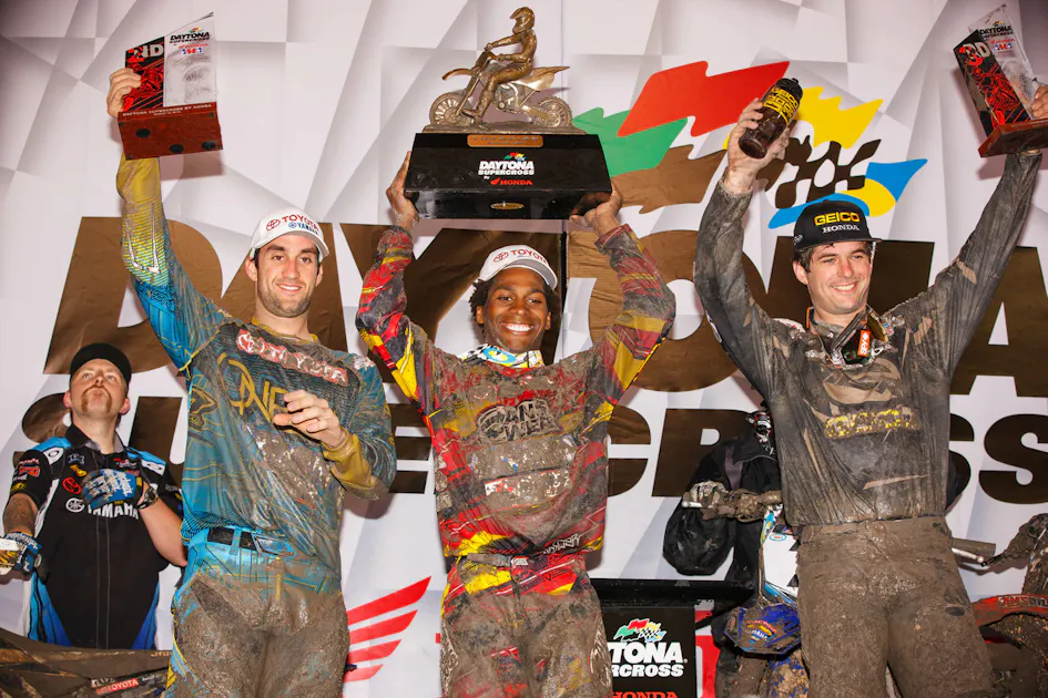 With the unfortunate news of the demise of Joe Gibbs Racing MX (2008-2020), we decided to look back at the North Carolina-based team’s single best motorcycle race. On March 10, 2012, James Stewart and teammate Davi Millsaps survived near-hurricane conditions to finish first and second on their JGR Yamahas in the 450SX main event at Daytona International Speedway—the one place on the AMA Supercross/Pro Motocross map that also hosts stock car racing, where the whole JGR program was rooted. It was also the last race Stewart would win with the team, as he was about to leave the squad completely. Millsaps, on the other hand, would finish second overall in the final 2012 Monster Energy AMA Supercross standings, the best championship finish in the 12-year run of Joe Gibbs Racing.
