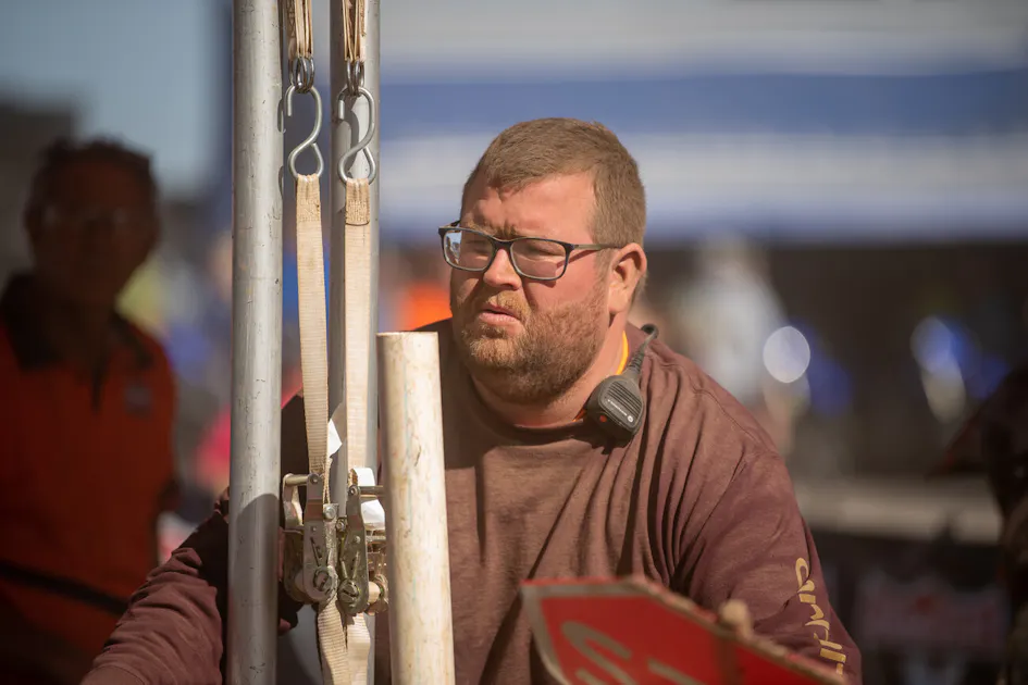 Excellent caution flagger form, looking down the track at Ironman. DC ![Jason Thomas lets Chase Sexton stay seated after the hot one at Fox Raceway.]()