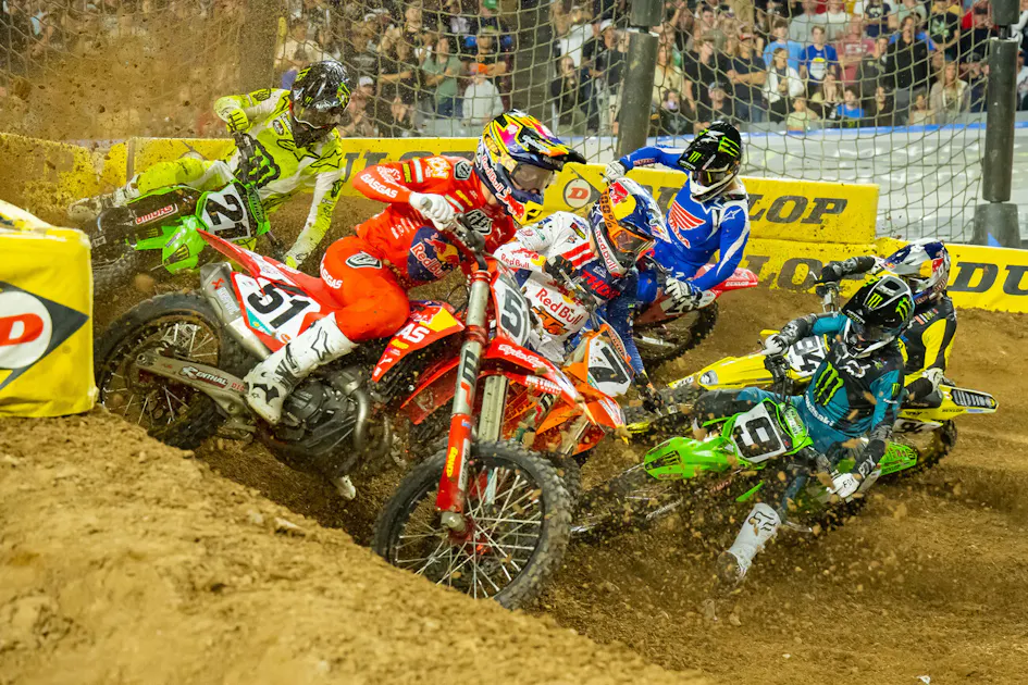 Throughout most of the 2023 Monster Energy AMA Supercross Championship the riders you see crowded together in this Glendale corner have been chasing the two guys not in this photo, title combatants Eli Tomac and Cooper Webb. Kawasaki’s Jason Anderson (21), Troy Lee Designs/Red Bull GasGas’ Justin Barcia (51), Red Bull KTM’s Aaron Plessinger (7), Honda’s Chase Sexton (23), Kawasaki’s Adam Cianciarulo (9), and Progressive/ Ecstar Suzuki’s Ken Roczen have all had their turns at the front (Sexton more so than the rest). But from the start of the series through the first 13 rounds, the red plate has only been passed back and forth by Yamaha’s Tomac and KTM’s Webb. And barring some last-minute drama, one of those two-time AMA Supercross Champions will be adding a third.