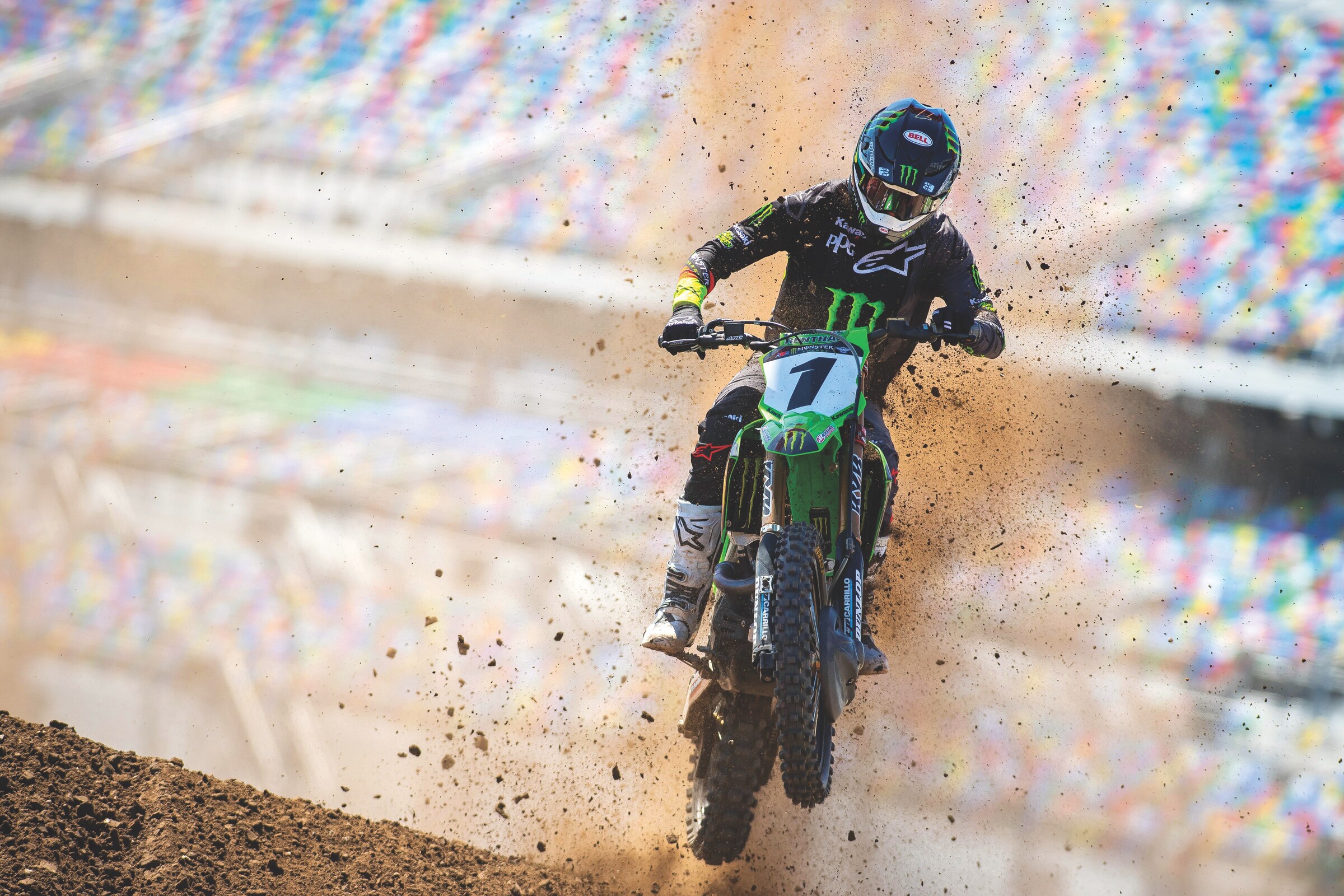 Read Gate Pics NowMonster Energy Kawasaki’s Eli Tomac preparing for a successful attempt at a record-tying fifth Daytona Supercross win.