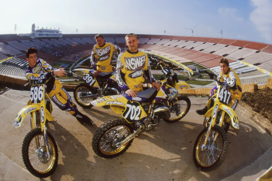 On the eve of the opening round of the 1997 AMA Supercross Championship at the Los Angeles Memorial Coliseum, the new Pit Pro Suzuki team got together underneath the Peristyle for a photo with Joe Bonnello. The team was organized by retired pro Russ Wageman and consisted of four fast California prospects: Chris Wheeler (586), Pat Foster (391), David Evilizer (702), and Tyler Evans (417).