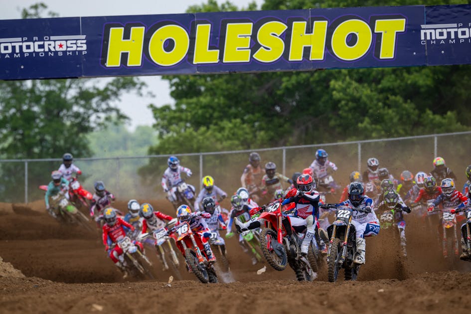 Honda HRC Progressive’s Jo Shimoda (30) and Triumph Factory Racing’s Jalek Swoll (22) nearly collided on the exit to the first turn at the Honda RedBud National before Jo zigged (with an added kung fu kick) and Jalek zagged, preventing disaster at the front of the pack. From here, Shimoda would post a 1-1 finish for his first overall of the season, while Swoll would finish second overall, a new high-water mark for the British brand in Pro Motocross.