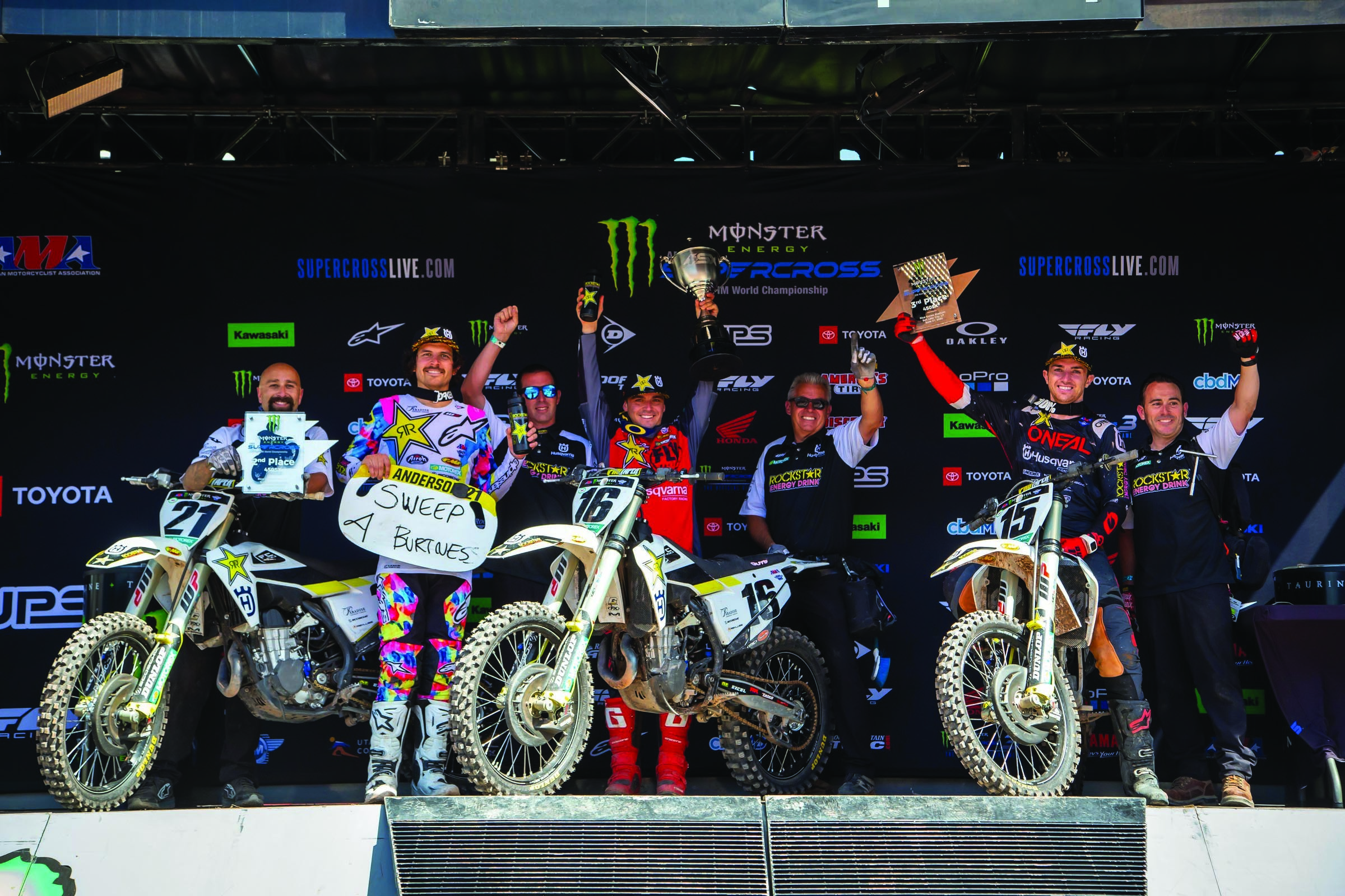 hewitt Team founder Bob Hewitt may not be with Rockstar Energy Husqvarna anymore, but his fingerprints were all over the last-round podium sweep, as Zach Osborne, Jason Anderson, and Dean Wilson were all hired by Hewitt. It was the first AMA 250/450 Supercross sweep since the 2004 Anaheim opener, where Yamaha’s Chad Reed, David Vuillemin, and Tim Ferry went 1-2-3.