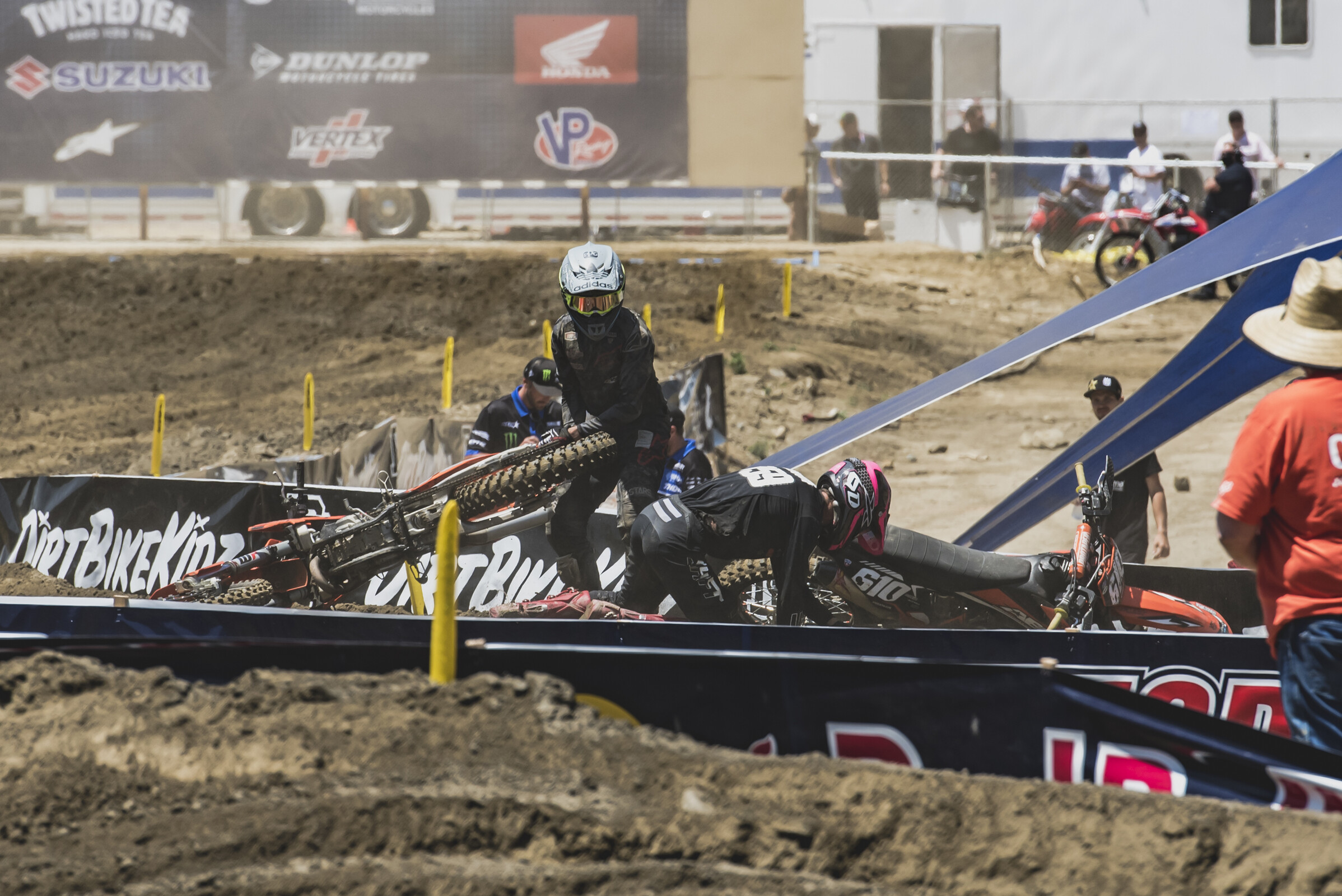 The very first gate drop of the 2021 Lucas Oil Pro Motocross Championship happened at Fox Raceway in Pala, California, but it wasn’t one of the actual motos. Rather, it was the Saturday morning 250 Class Last Chance Qualifier. One rider—Redlands, California’s Max Groom—went down on his #959 Chrysler Works–sponsored KTM 250 SX-F and found himself stuck under his bike. Coming up behind him was the Grindstone-backed #610 KTM of Hemet’s Nicolas Gonzalez. Seeing that a fellow racer was obviously stuck under his bike, Gonzalez stopped and dropped his own bike to help Groom. It all but assured that Gonzalez was not going to qualify for the national—they only take the top four out of the four-lap sprint—but it did make for an instant friendship between the two riders involved. It also caught the eye of privateer photographer Dan Acosta, one of the few shooters out there for the 250 LCQ, who also posts his shots of privateer heroes like this on his Instagram feed @cycledump. We wanted to re-run Acosta’s image of this almost completely overlooked moment in the magazine to give Nicolas Gonzalez recognition for such a selfless act in the middle of a moto. As for Max Groom, one week later he made the cut for the 250 Class motos at Thunder Valley. Here’s hoping they get together again soon, only this time it’s in a main event and neither guy goes down!